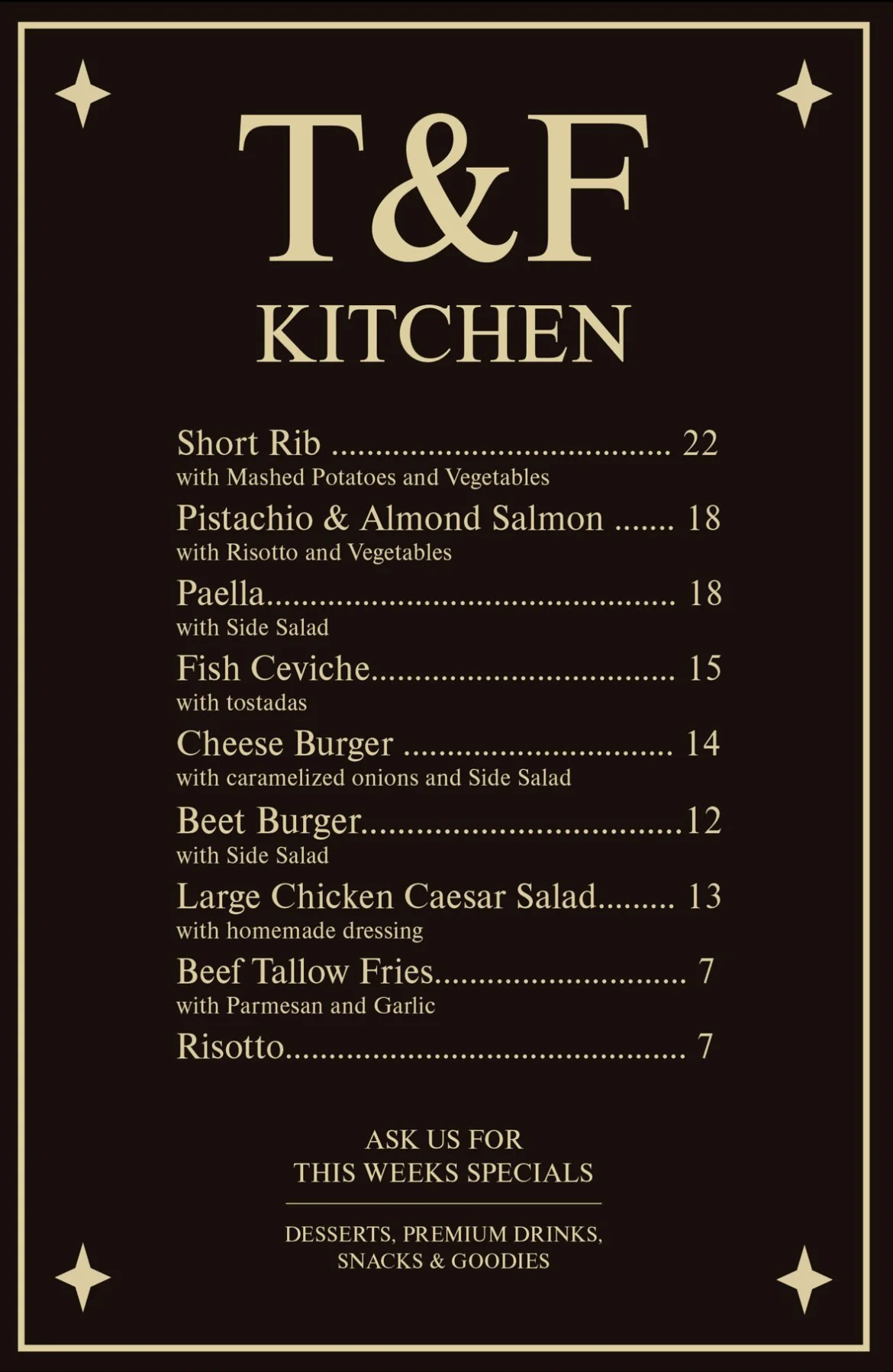Rooted in family tradition and inspired by a passion for artistry, T&F is a space where nourishment, creativity, and connection come together. Every dish is crafted with intention, blending home-cooked recipes with modern, chef-driven flair.